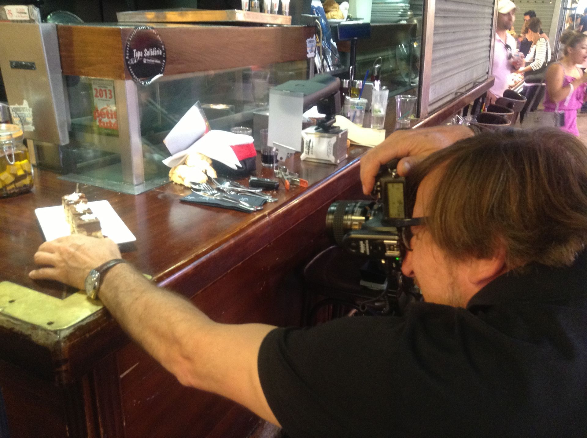 Las fotos del principio tenían que plasmar la imagen de hace 25 años, así que tuvimos que buscar atrezzo de la época y, cómo no, hizo su aparición el socorrido plato Duralex, a juego con la superficie de la barra que por aquel entonces era de aluminio. Por otro lado, nos encontramos con que teníamos que hacer las fotos en el mismo quiosco donde sirve los deliciosos platos. Eso implicaba un espacio reducido y, por supuesto, una cantidad ingente de turistas paseando alrededor. Tuvimos que utilizar flash portátiles, dos principales y uno de relleno en algún caso, y la verdad es que el resultado es espectacular. Tanto como los platos que prepara Quim, deliciosos,........¡mmm!........el timbal de setas con foie y huevo frito……¡me lo comí yo!